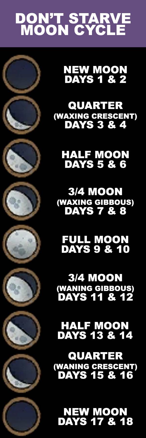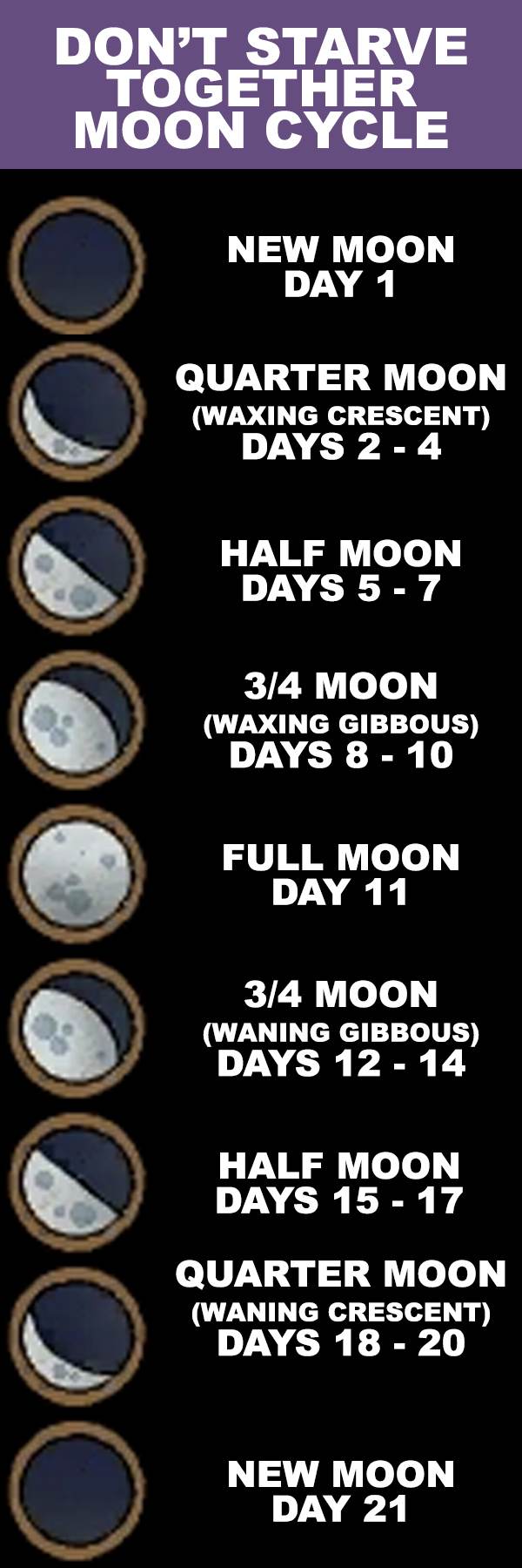 It is important to note that the image and information above does not reflect the days in which the Moon cycles in Don’t Starve Together (DST), however, it does reflect the Moon Cycle of sing-player versions of Don’t Starve (DS) including Shipwrecked (SW), Reign of Giants (RoG) and Hamlet (HAM).